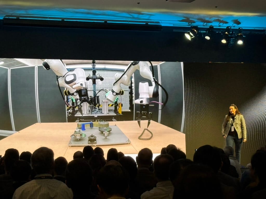 A startup focused on teleoperation presented its vision for accelerating robotics deployment by making it easy for robots to be remotely operated when autonomous capabilities are insufficient. The system uses advanced VR interfaces and haptic feedback to give operators a sense of presence and control, enabling them to perform complex manipulation tasks remotely.