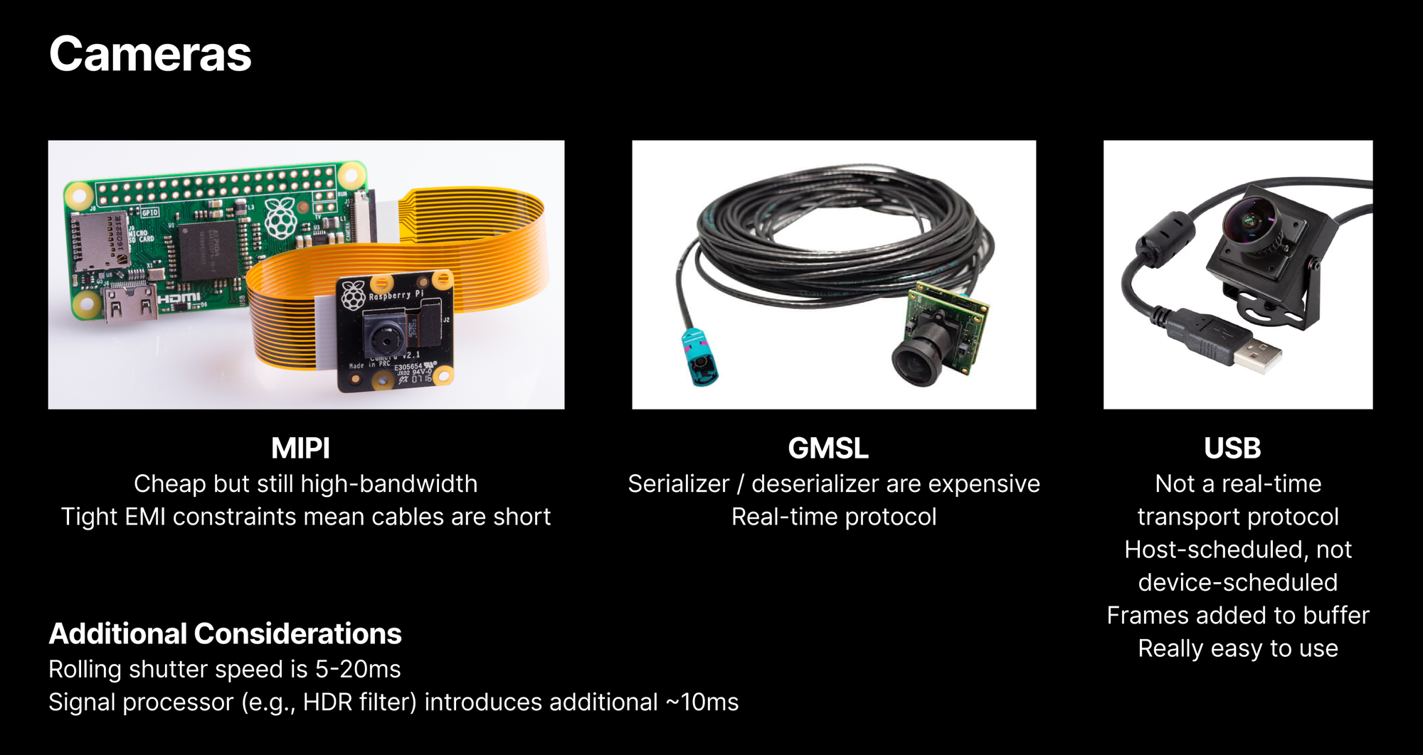 Ben expects MIPI cameras to win out over GMSL (too expensive at ~$10K per serializer) and USB (too high latency). This constrains camera placement: MIPI requires proximity to compute, meaning head-mounted cameras will likely dominate over hand cameras for manipulation tasks—a contrarian view in the robotics community.