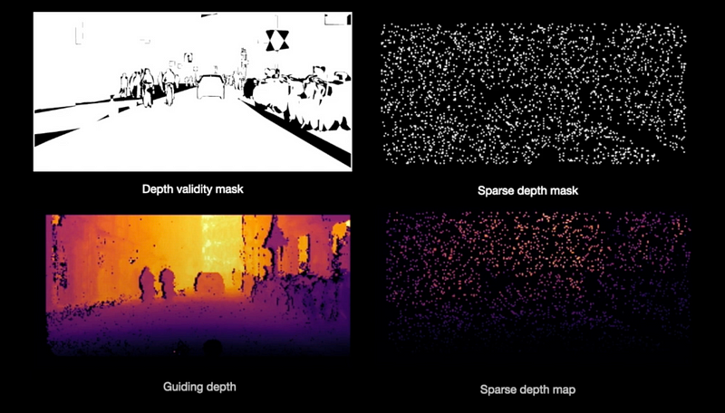 Note: Depth completion is a computer vision task where sparse depth information — such as data from LiDAR sensors, which only provides depth at certain points — is used to create a dense depth map, filling in the gaps to produce depth information for every pixel in the image. This dense depth map provides a more complete 3D understanding of the scene, which is crucial for tasks like obstacle detection, navigation, and scene reconstruction in robotics and autonomous systems.