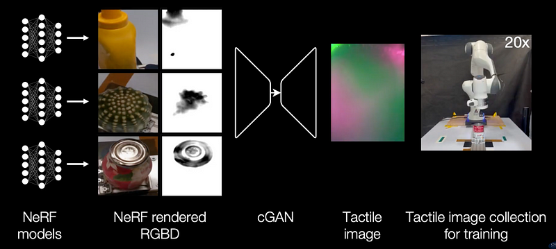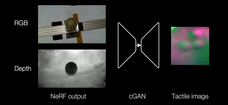 One way to address this issue is by creating synthetic tactile datasets or collections of synthetic tactile sensor responses using generative models, specifically for use in downstream robotics applications. For example, the approach described in the “Touching a NeRF” paper by Zhong and colleagues [5] involves taking RGB-D images — images that include both color and depth information — as inputs and generating corresponding “tactile images.” This is one method to attempt to create realistic tactile data.
