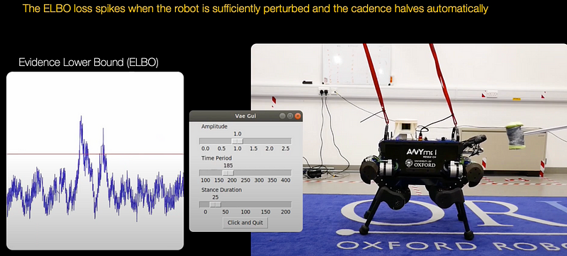Below is an example of a project aiming to change this — the project focuses on learning a latent space and capturing the key stance phases of a particular gait via a generative model trained on a single trot style. (Here, a latent space refers to a lower-dimensional representation of data that captures the underlying structure or features in a way that simplifies analysis or modeling.) Properties of a drive signal map directly to gait parameters such as cadence, footstep height, and stance duration. In effect, the use of a generative model allows for the detection and mitigation of disturbances.