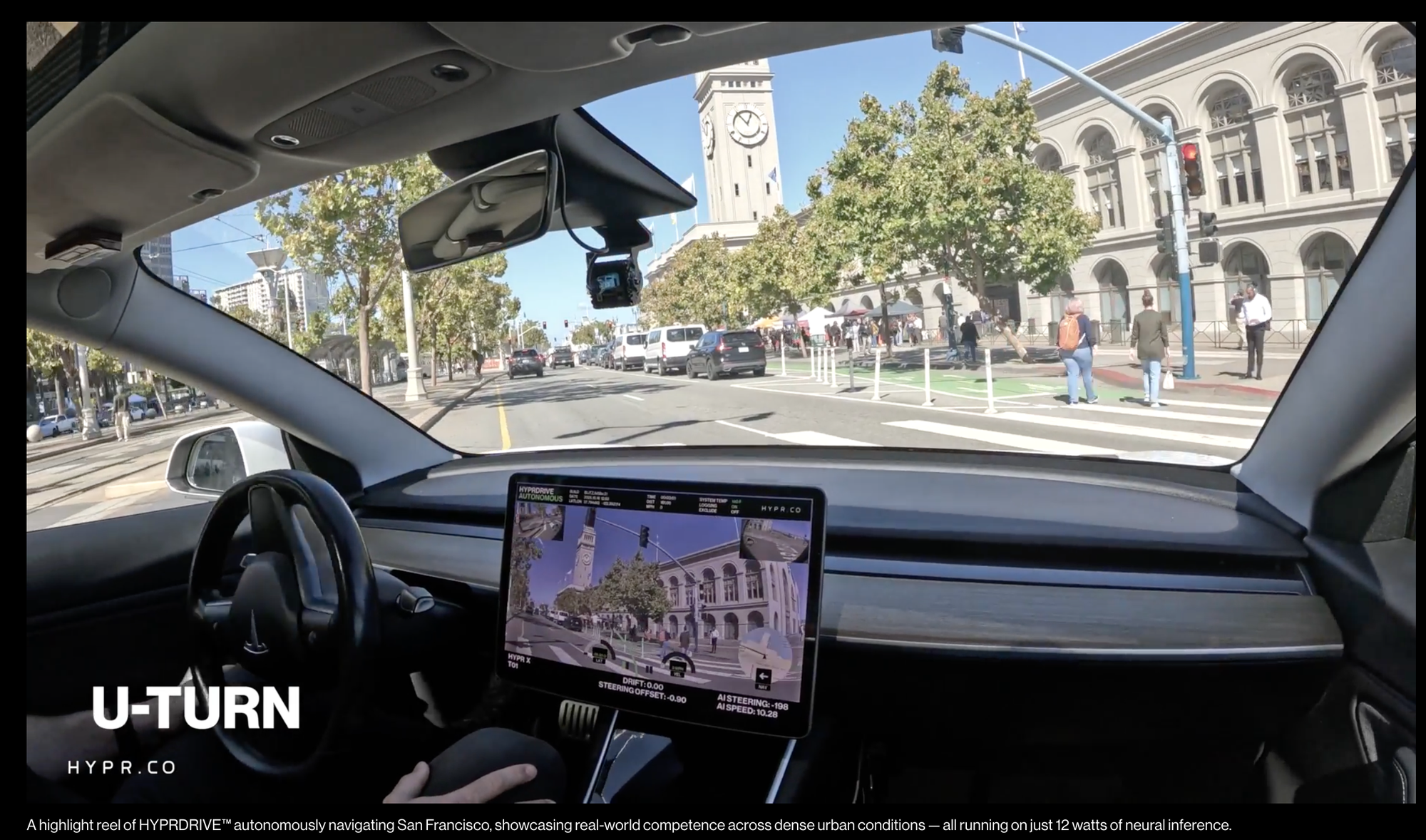 A highlight reel of HYPRDRIVE™ autonomously navigating San Francisco, showcasing real-world competence across dense urban conditions — all running on just 12 watts of neural inference.