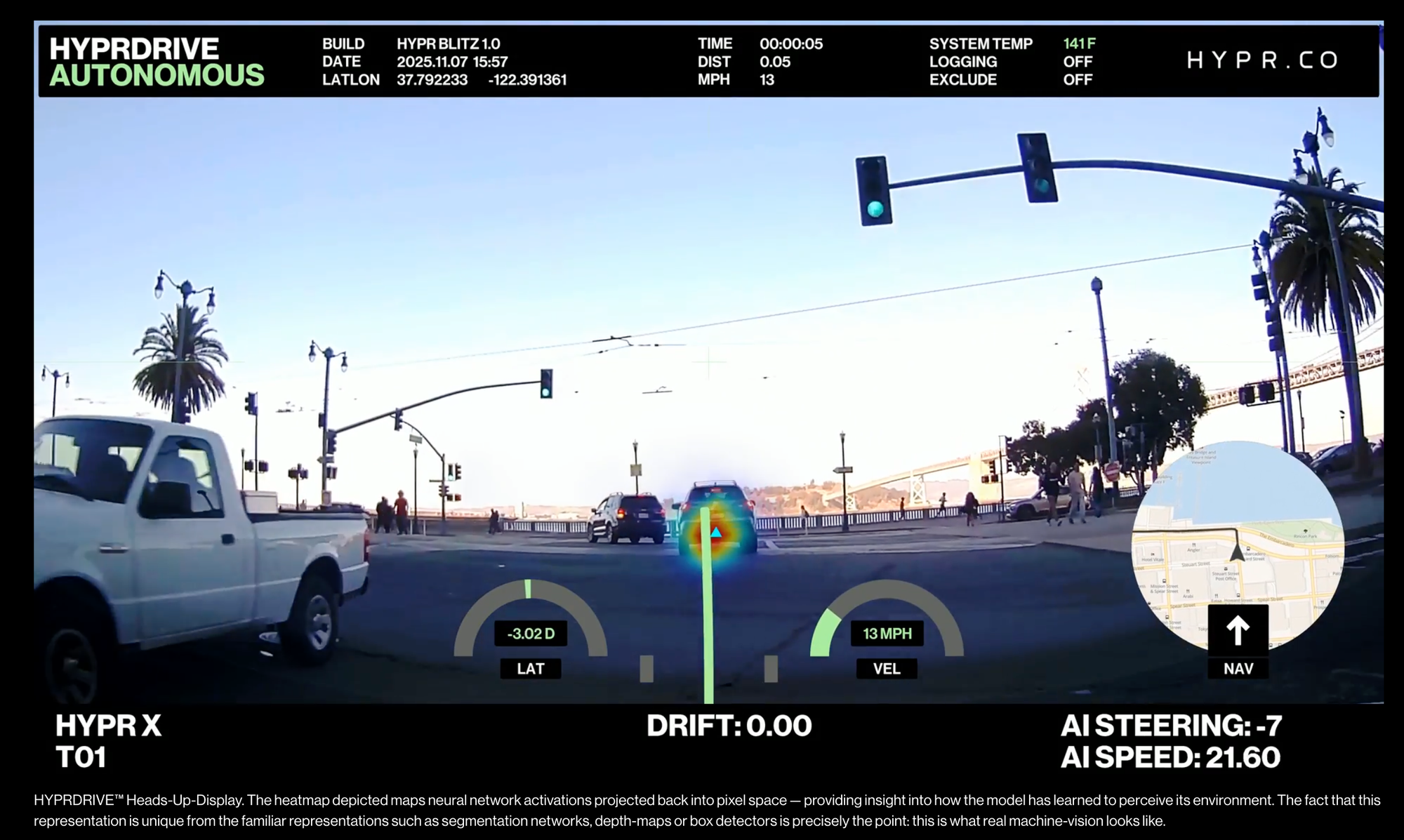 HYPRDRIVE™ Heads-Up-Display. The heatmap depicted maps neural network activations projected back into pixel space — providing insight into how the model has learned to perceive its environment. The fact that this representation is unique from the familiar representations such as segmentation networks, depth-maps or box detectors is precisely the point: this is what real machine-vision looks like.
