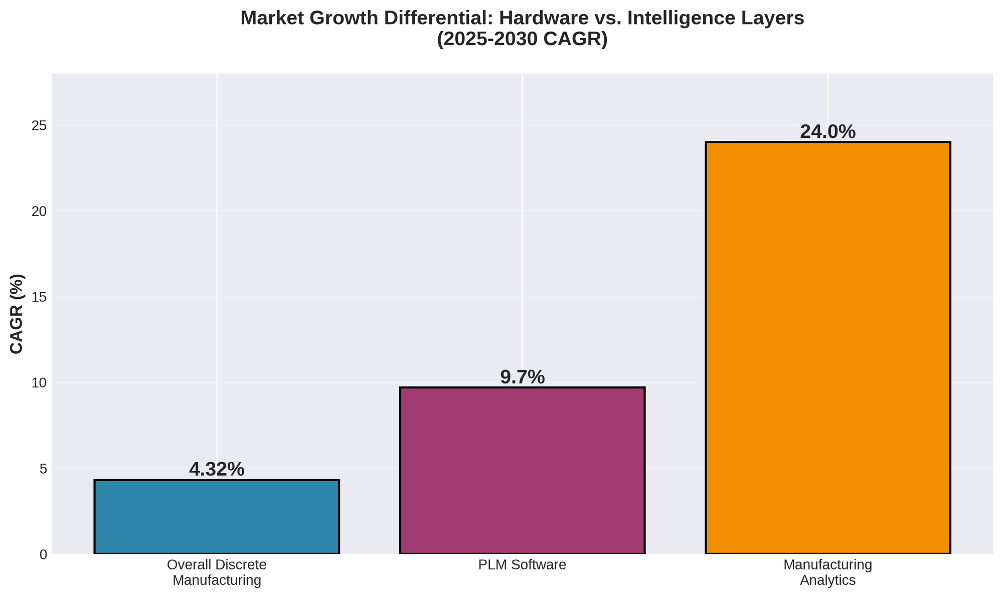 The discrete manufacturing market is a cornerstone of the global economy, with an estimated size of $554 billion in 2025, projected to grow to over $811 billion by 2034 at a CAGR of 4.32% [3]. While massive, the market size is less important than its structure. The key takeaway for investors is the significant growth differential between the commoditized hardware layers and the emerging, high-margin intelligence layers. The market for Product Lifecycle Management (PLM) software, for example, is growing at a CAGR of 9.7%, while the manufacturing analytics market is growing at an explosive 24% CAGR [12] [13]. This stark contrast highlights the clear migration of value from hardware to intelligence.