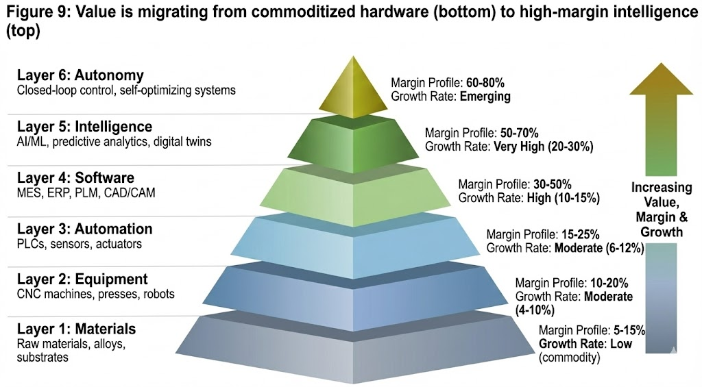 The key insight for investors is that value has been steadily migrating up this stack for decades. The equipment layer (Layer 2) has become increasingly commoditized, with intense price competition and razor-thin margins for all but the most specialized machines. The automation layer (Layer 3) is mature and consolidated, dominated by a handful of industrial giants.