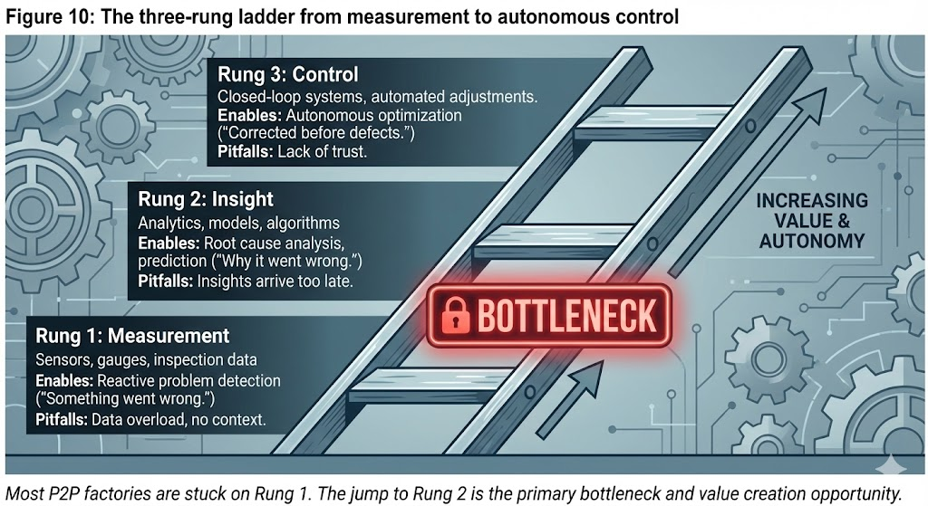 Most P2P factories today are stuck on Rung 1. They have abundant measurement but limited insight, and almost no autonomous control. The jump from Rung 1 to Rung 2 is the primary bottleneck, and it is where the most significant value can be created. This is the domain of the intelligence layer—companies that can take fragmented, batch-level data and transform it into predictive, process-level insights that compound over time.