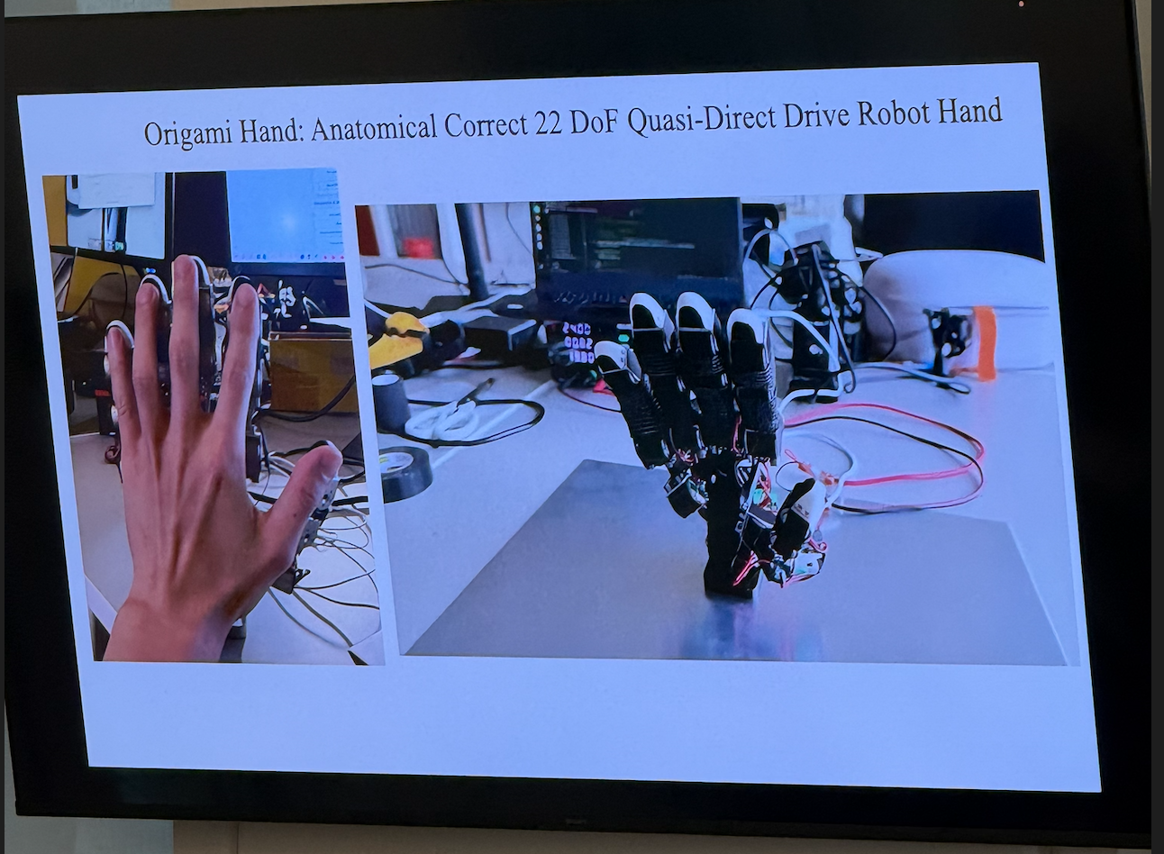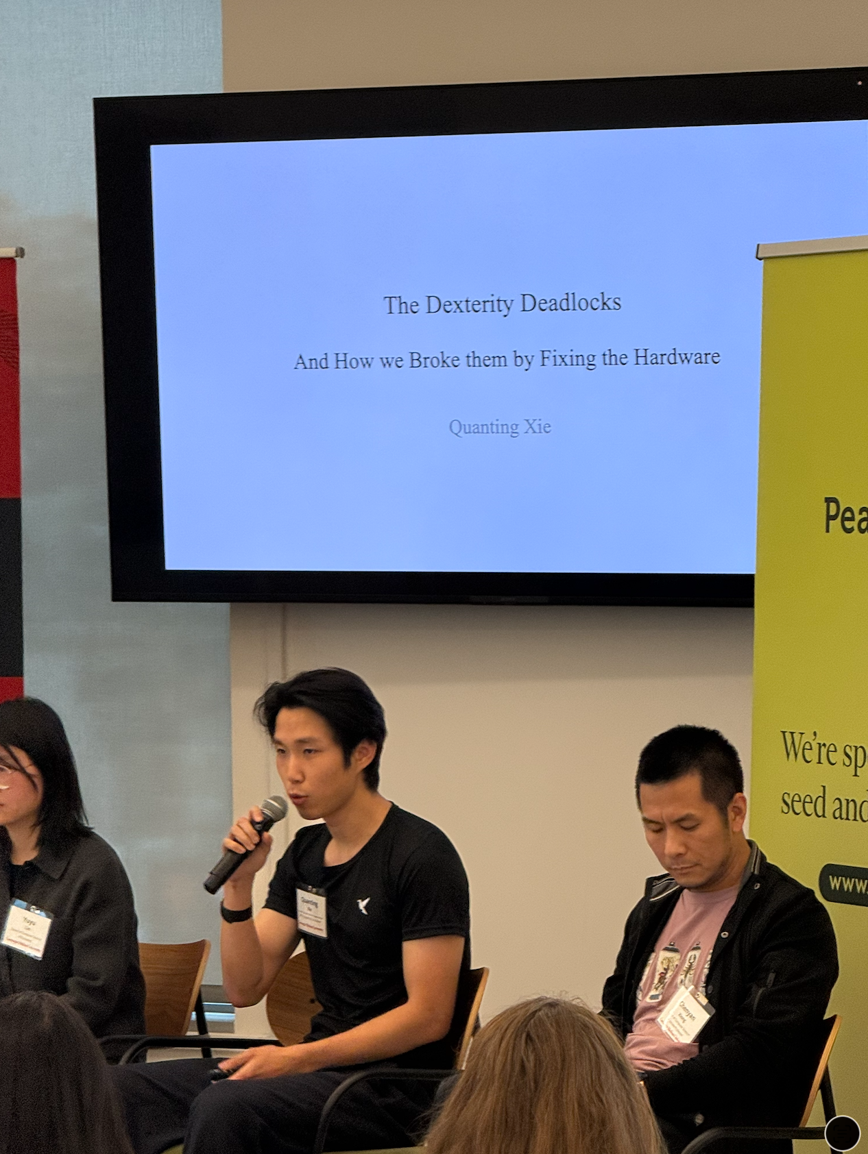 The talk was called "The Dexterity Deadlocks — And How We Broke Them by Fixing the Hardware," delivered by Quanting Xie, a PhD student at CMU's Robotics Institute and co-founder of a startup called Origami Hand.