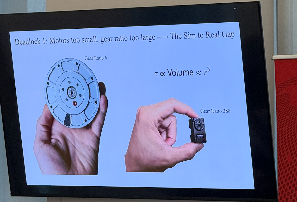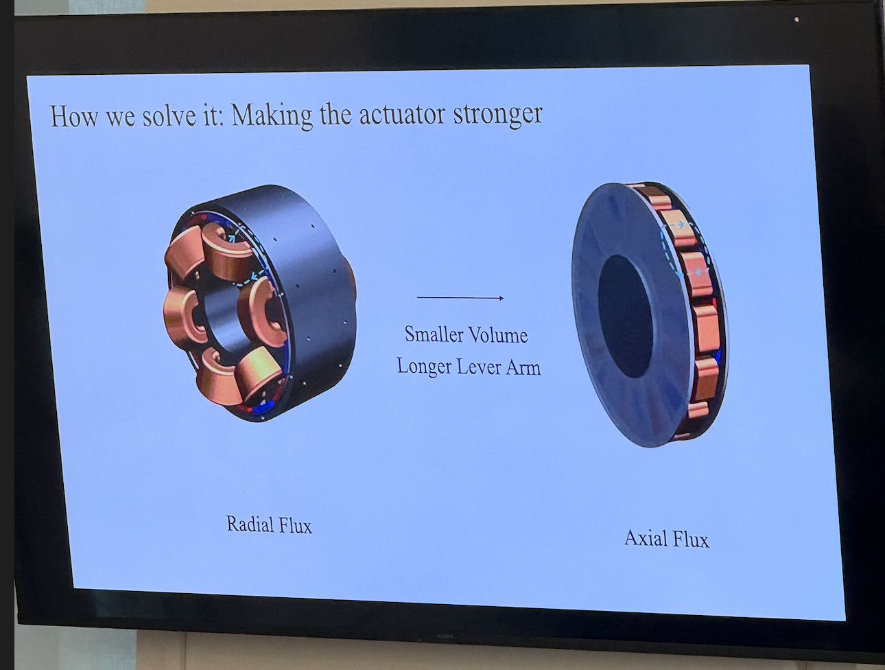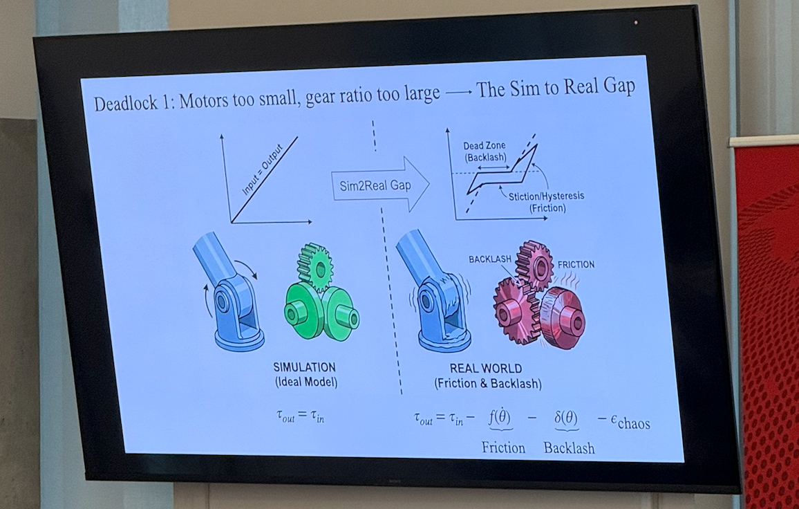 This matters because it breaks the deadlock chain. With 1.6x the torque density, you can use dramatically lower gear ratios and still get the output torque you need. Lower gear ratios mean less friction, less backlash, less reflected inertia — and a much smaller sim-to-real gap.