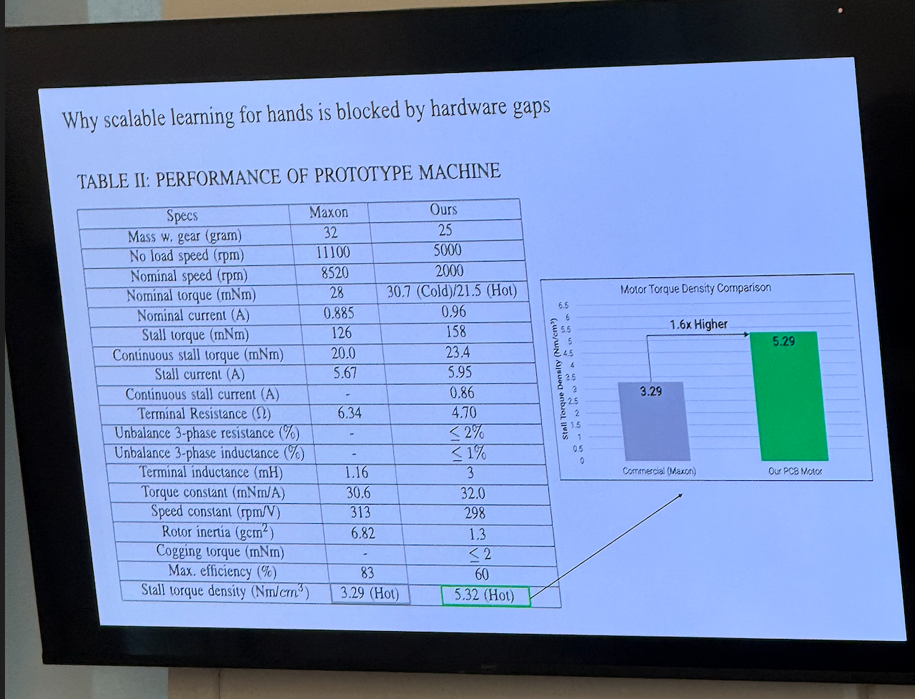 Their prototype PCB motor achieved a stall torque density of 5.32 Nm/cm³ — compared to 3.29 Nm/cm³ for the best comparable commercial motor (Maxon). That's 1.6x more torque-dense, in a package that's actually lighter (25g vs. 32g).