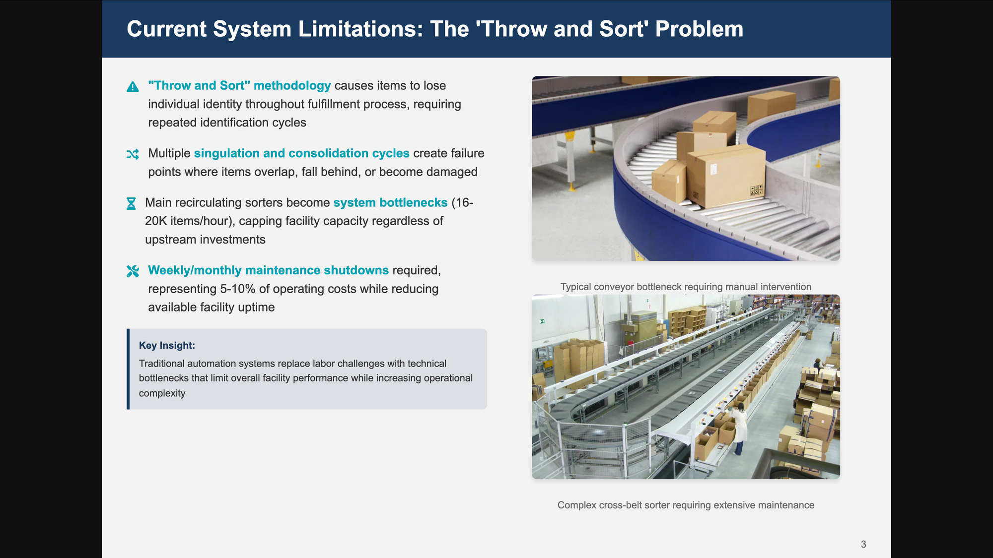 The fundamental limitation of robotic induction systems is that they address symptoms rather than causes. By automating the placement of items onto sortation systems, these solutions add complexity and cost while failing to address the underlying "throw and sort" problem that necessitates induction in the first place.