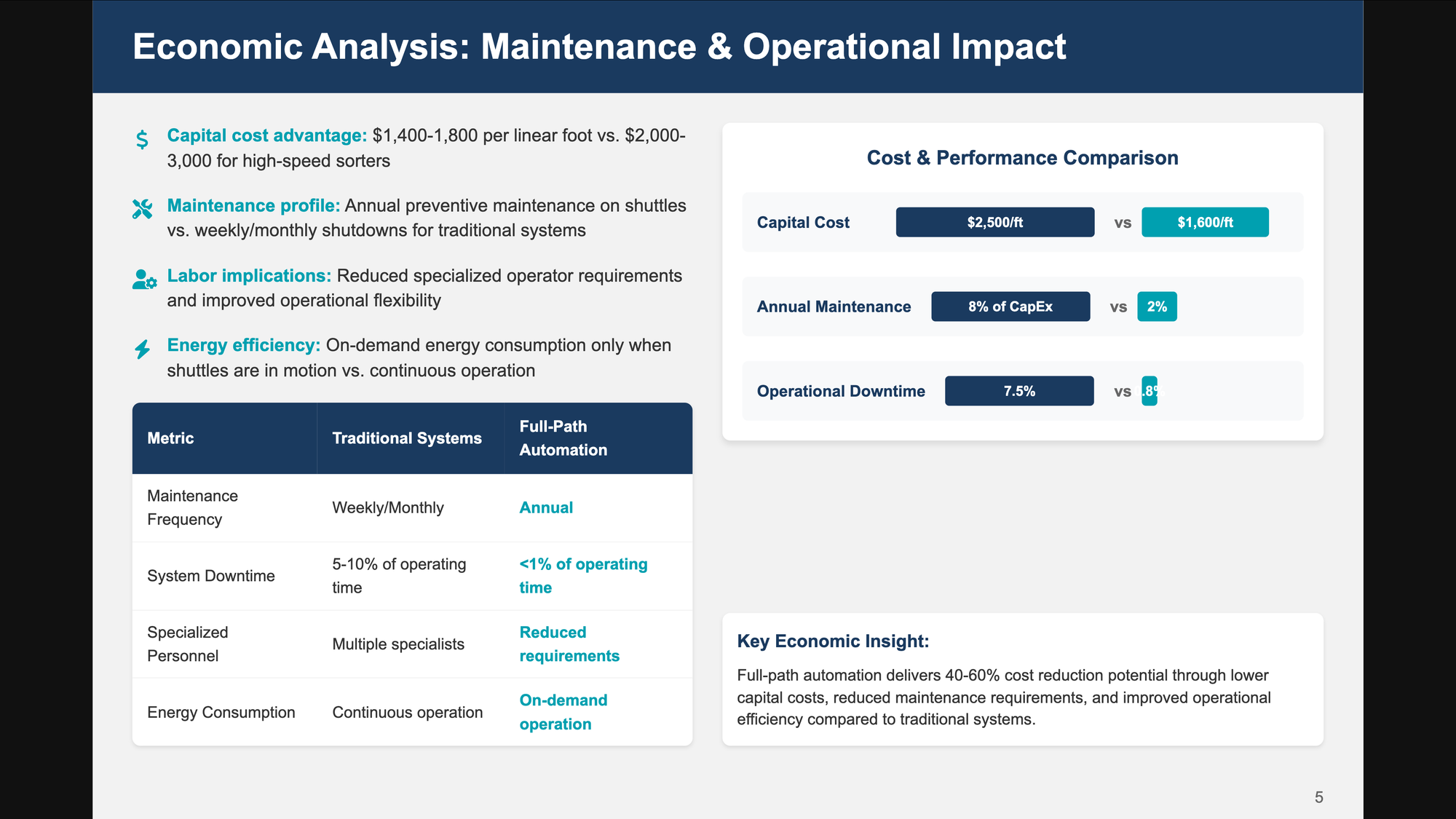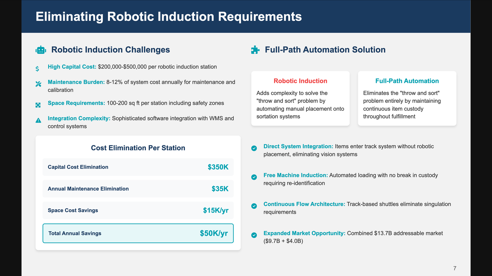 The investment opportunity extends beyond simple market size considerations to include the strategic advantages of comprehensive solutions that eliminate multiple system components and their associated costs. This positioning enables full-path automation providers to access broader customer bases while providing more compelling value propositions than traditional component-based approaches.