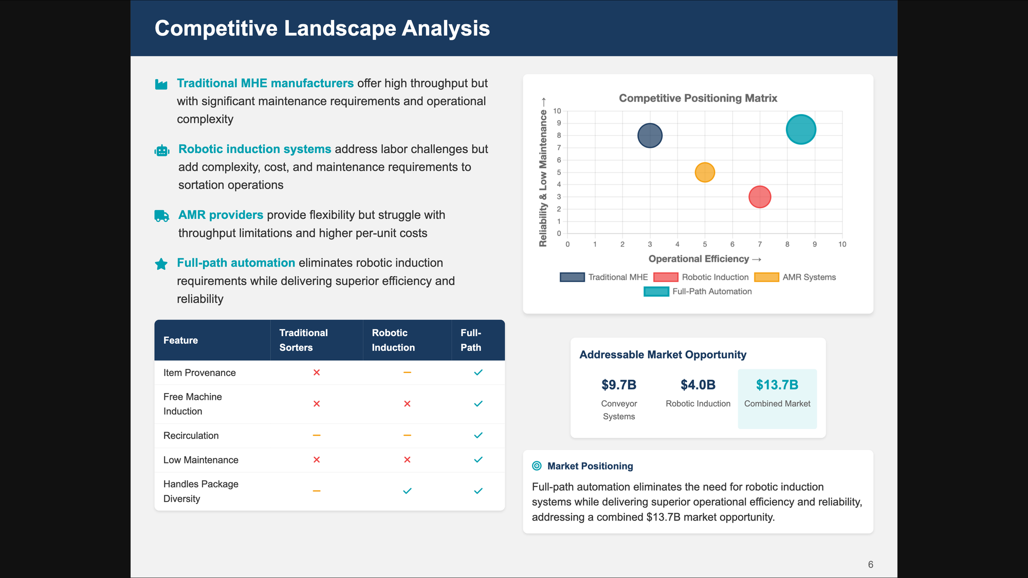 The comprehensive analysis presented in this report demonstrates that full-path automation technology offers superior technical performance, economic advantages, and strategic positioning compared to traditional warehouse automation approaches. By eliminating robotic induction requirements while providing comprehensive automation capabilities, this technology addresses a combined market opportunity of $13.7 billion while delivering measurable operational and economic benefits.