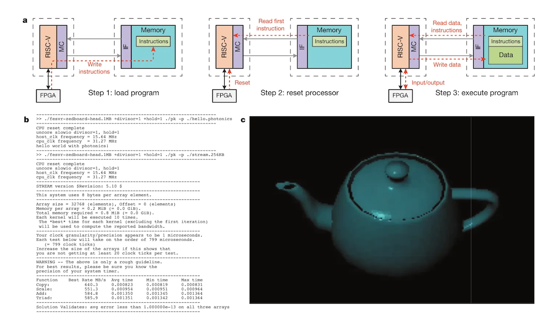 Figure 8: Demonstration of the photonic microprocessor running programs including "Hello World!" and a 3D teapot renderer, all communicating with memory over optical links. Source: Sun et al., Nature 2015 [11]