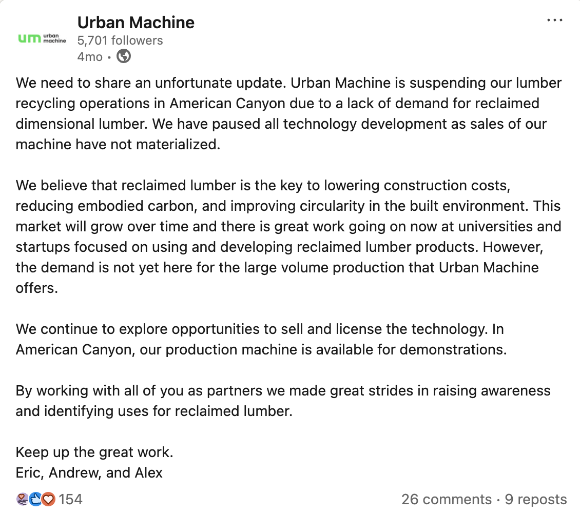 Urban Machine suspending lumber recycling operations in American Canyon due to a lack of demand